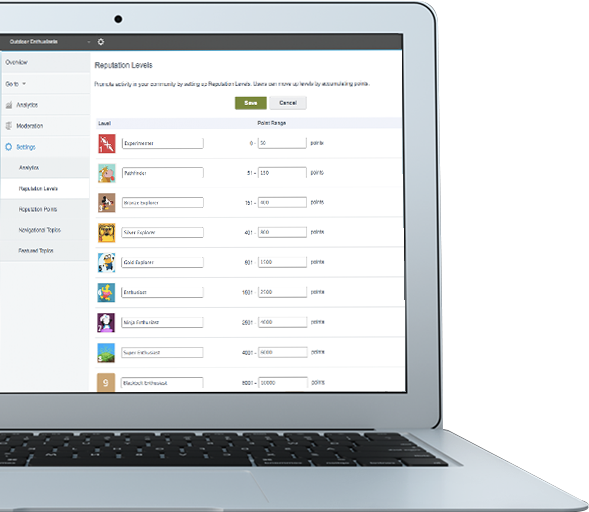 Community Cloud功能 - 客户网络互动方案 制订专属的社区成员互动方案,突显活跃成员并给予一定奖励,让社区更加富有生 机。社区成员可以利用平台现有徽章,对其他成员进行认可。您也可以自定义企业专属徽章,奖励特定的专业技术。通过成员互帮互助,调动成员的参与积极性。 加强社区成员互动 建立绩分体制 成员在平台上的行为都可以为其获得不同的分数,查看累积的得分,可以看到成员在社区中的参与度。对于积极参与的成员,也可以采取一定的奖励措施。按您自己的需求创建排名、徽章和得分体系来激励成员,让他们达到您所期望的行为。 授予徽章 在企业社区平台上,我们提供了各种不同的徽章,借此彰显各位成员对企业所作的不同贡献。根据您企业的自身情况,您还可以创建自己的专属徽章,向作出贡献的成员表达谢意。 |