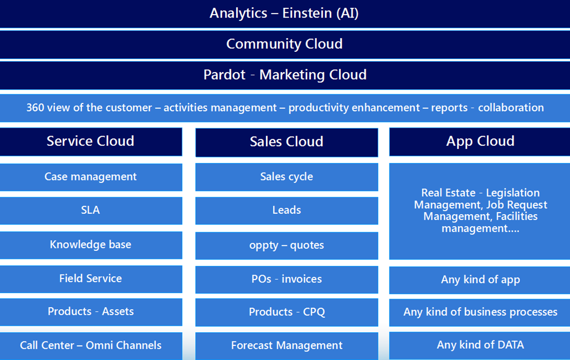 | Anticipate sales opportunities with Sales Cloud Einstein. | Proactively resolve cases with Service Cloud Einstein. | Create predictive journeys with Marketing Cloud Einstein. | Embed intelligence in every app with App Cloud Einstein. |