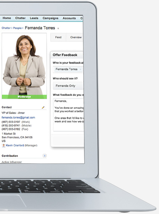 销售业绩管理 使用Work.com对销售业绩进行管理分析,让销售人员获得更好的培训、激励,促使团队更好地合作。 Salesforce销售业绩管理系统可让您提升业务的一致性并达成更多交易。 分析销售业绩,管理销售趋向 以结果为导向,激励销售代表 通过Salesforce销售业绩管理系统,可以直接激励您的销售团队或对销售团队进行培训。通过培训,可以帮助更多销售代表达成每月的配额。您还可以通过销售团队管理工具公开表彰业绩出众者并分享他们达成交易的方法。将销售目标直接与Salesforce数据关联 通过了解您在Salesforce中的所有销售数据,您可以制定与Salesforce报表直接相关的业绩目标,从而轻松跟踪和衡量您的月进度、季进度和年进度。 增强公司全体人员的参与感 成功的销售与企业各个层级的人员息息相关。Salesforce提供Chatter上客户和联系人的每条对话记录,方便您分析并分享见解、获得相关文件等。 使用拖放操作简化业绩总结 专注于销售,而不是专注于书面工作。无论一个月、一个季度,还是刚完成项目,或是刚达到目标,您可以选择对任意的时间段进行业绩评估。 |